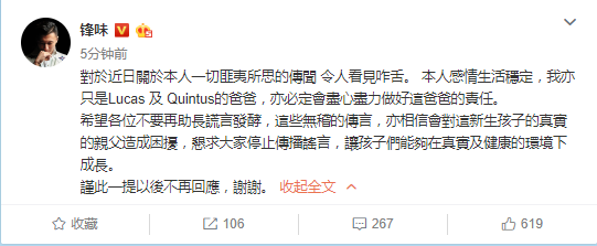 对于近日关于本人一切匪夷所思的传闻 令人看见咋舌。本人感情生活稳定,我亦只是Lucas及Quintus的爸爸,亦必定会尽心尽力做好这爸爸的责任。