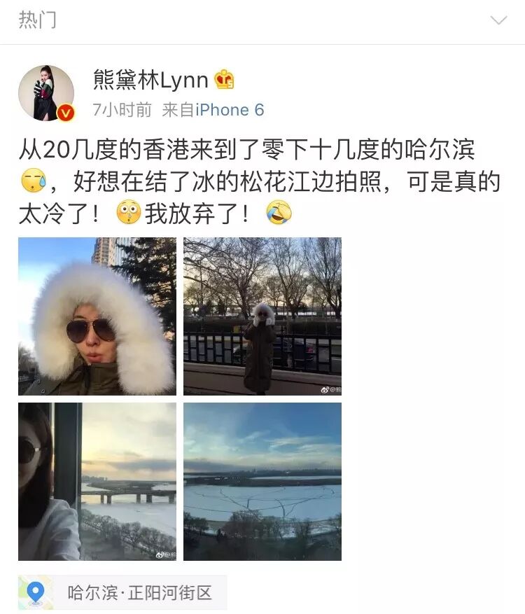 看来熊黛林已经切实地感受到了我们大哈尔滨的“美丽冻人”了!哈尔滨果然“招星能力”棒棒哒~不信?请戳小编之前与大家分享过的消息(猛戳蓝字):