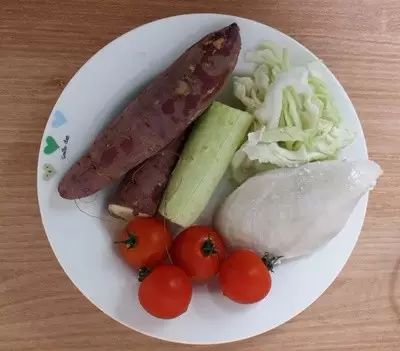 8点:小西红柿4个,红薯1个(120~150g),鸡胸肉一块(煮熟,100g),蔬菜(黄瓜,白菜等,不加调味料)