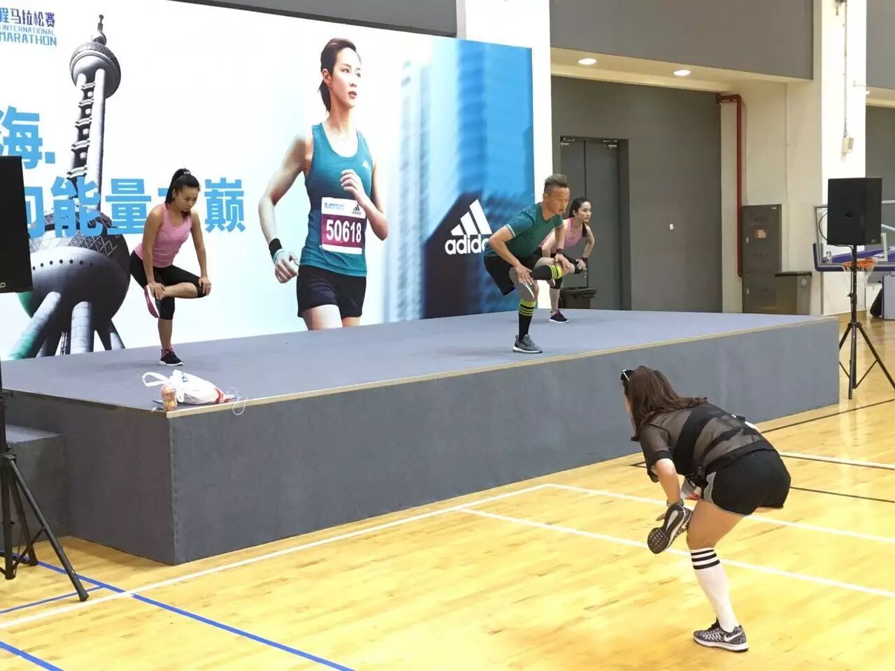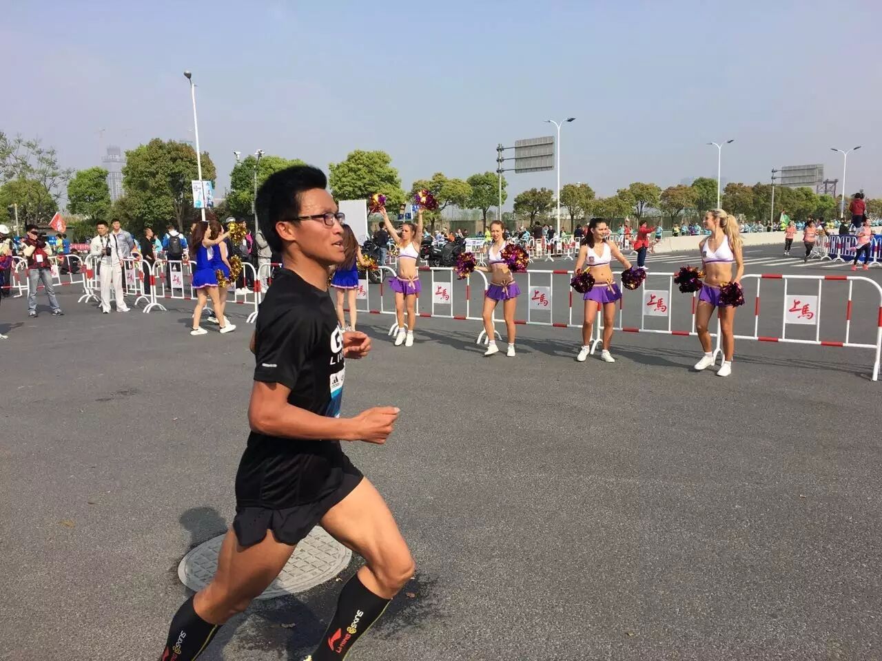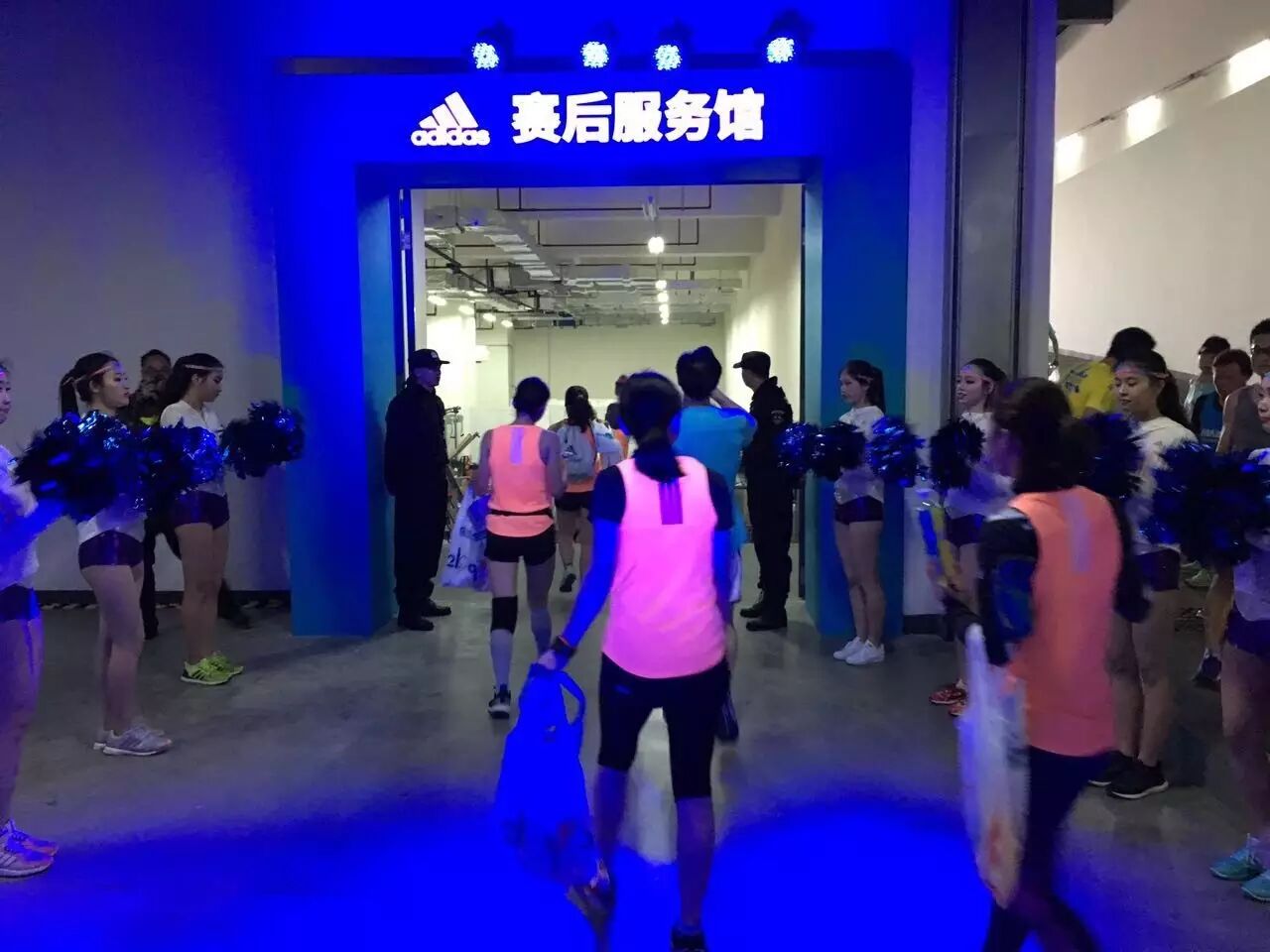 跑过东方体育中心附近最后的一段折返后,8位靓丽的拉拉队姑娘在100米冲刺处为大家热情助威。