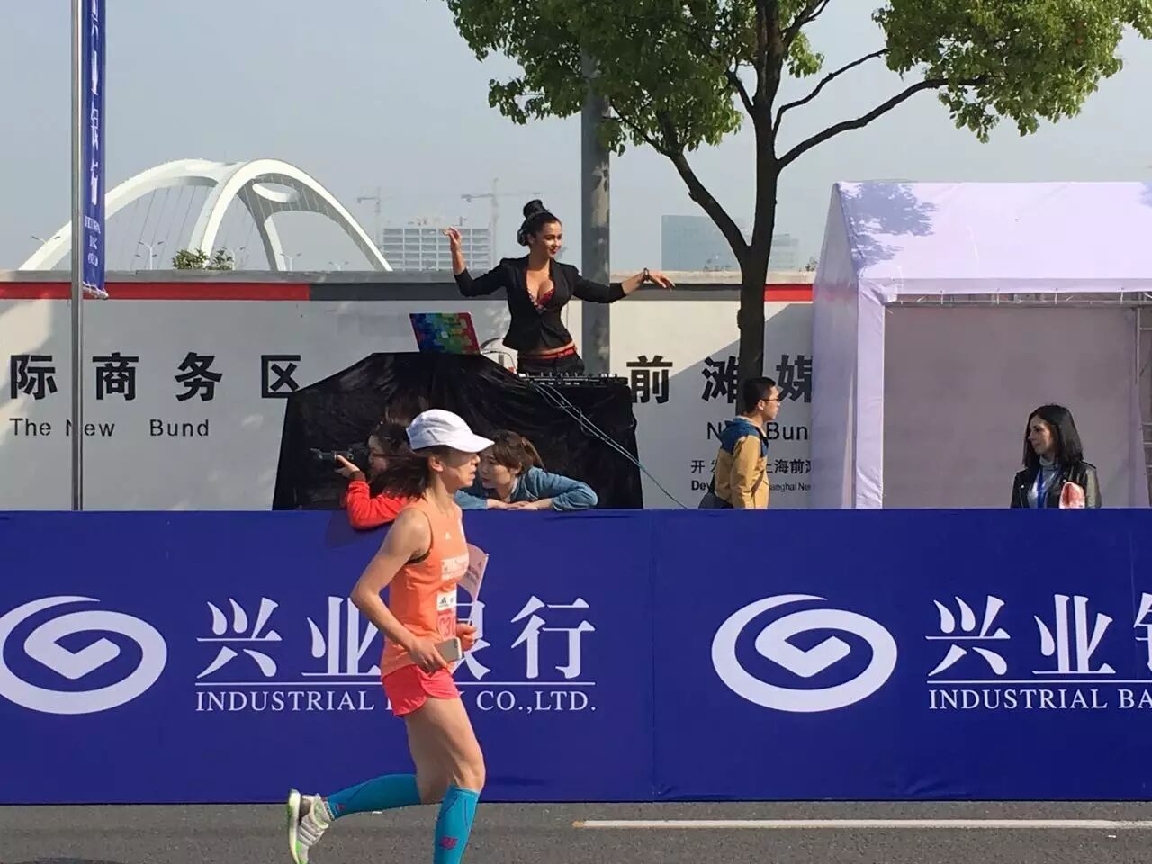 终点区域气氛超嗨,其中一半功劳得记在这位身材火辣、不停舞动身姿的女DJ身上。