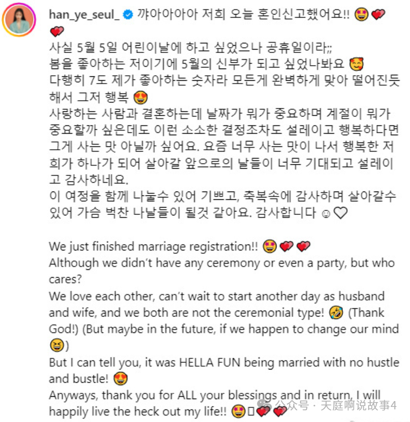 2024年5月7日,韩国著名演员韩艺瑟在她的社交媒体上分享了一个令人振奋的消息——她已经与相恋多年的男友正式登记结婚,开启了新的生活篇章。这对情侣选择了一种非常简单且私密的方式来庆祝这一生命里的重要时刻,没有举行任何形式的仪式,也没有举办盛大的派对。韩艺瑟在她的宣布中写道:“虽然我们没有任何仪式,甚至没有派对,但谁在乎呢?我们相爱并迫不及待要以夫妻身份开启新的一天。”
