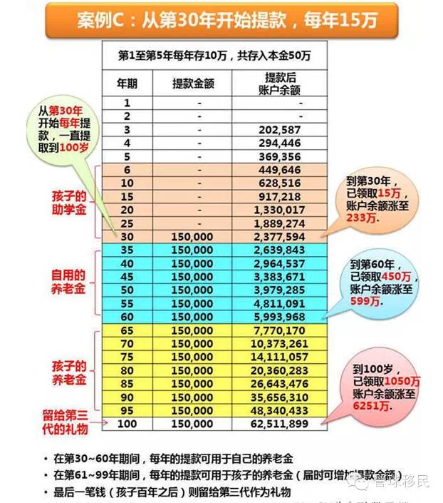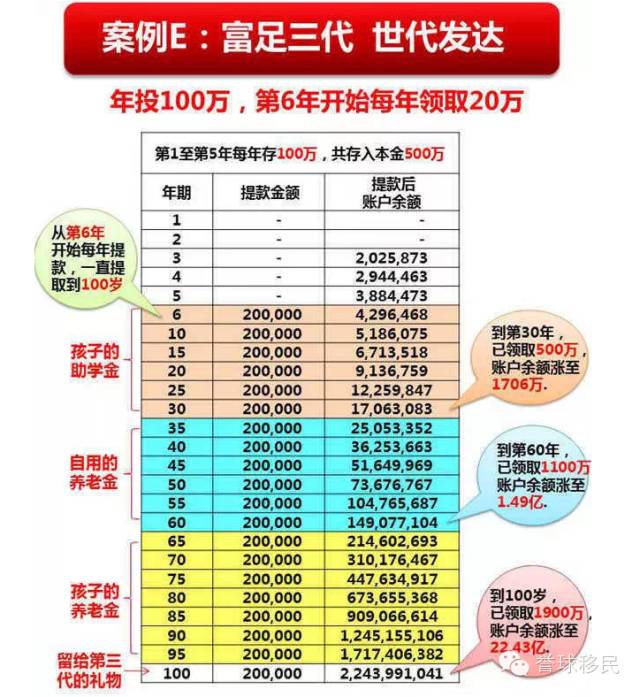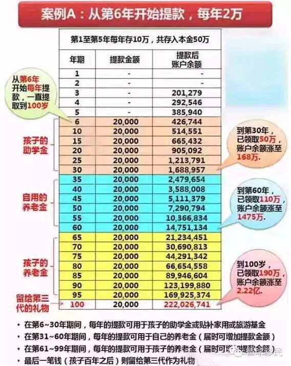 案例A: 5年共投入本金50万元,从第6年开始每年取款2万元直至100岁,共领取了95年合计190万元,此时账户余额仍高达2亿2200万!