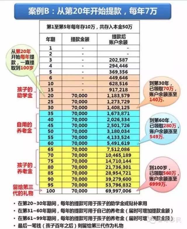 案例B: 5年共投入本金50万元,从第20年开始每年取款7万元直至100岁