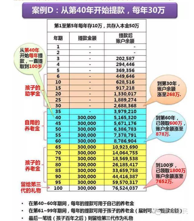 案例D: 5年共投入本金50万元,从第40年开始每年取款30万元直至100岁