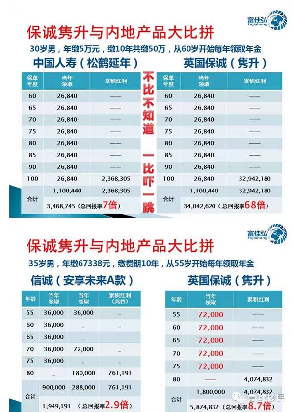 下面我们看看,在同样的被保人、同样的缴费金额、同样的缴费条件下,【隽升】与中国内地同类产品对比情况: