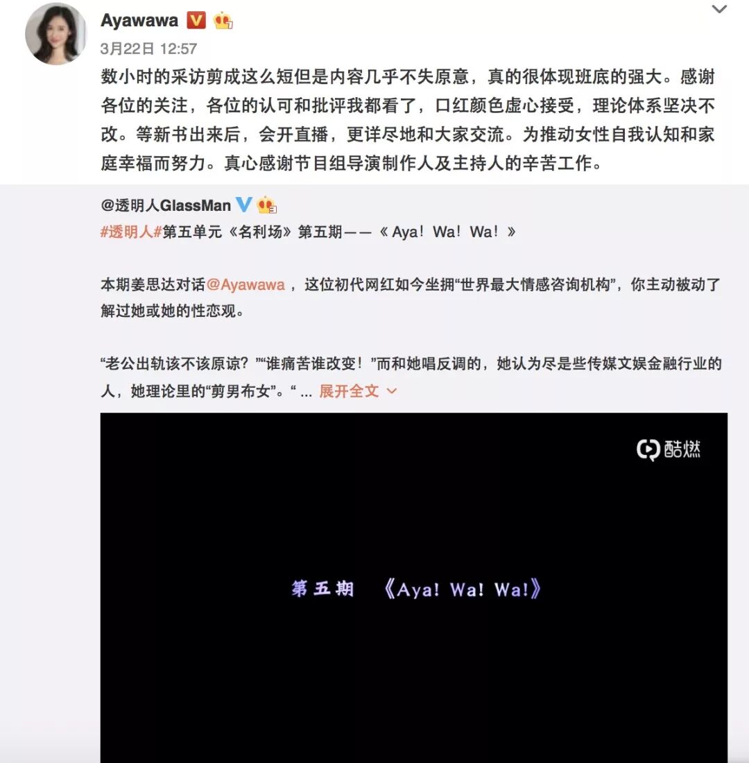 近日,在视频访谈节目《透明人》的一期节目中,姜思达采访了自诩为女性婚恋情感教母,致力于帮助广大女性解决婚姻情感难题的ayawawa(本名杨冰阳)。