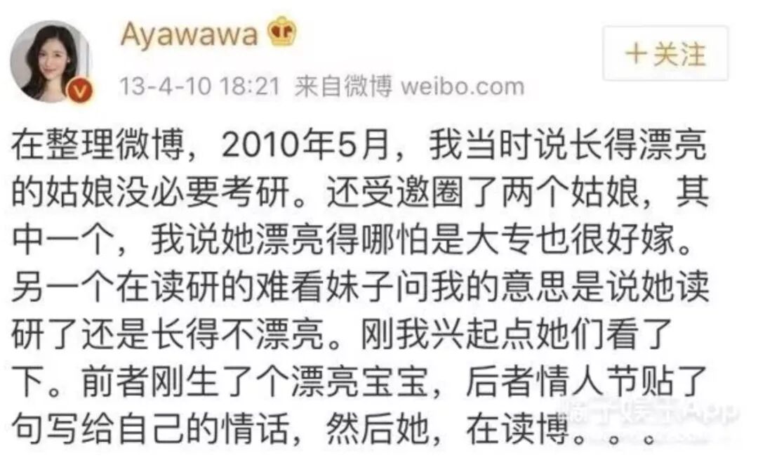 而且,ayawawa真的非常热衷给女性的颜值打分:人丑就要多读书,好看早结婚。