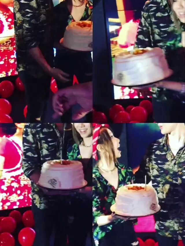 在另一张大合照中,邓紫棋手捧蛋糕站在中间,赌王女儿何超莲则手里拿着“HAPPY BIRTHDAY”的提字板站在邓紫棋左侧,而站在邓紫棋右侧的则是她的造型师男友Mark。两人都不约而同的选择了花衬衫+破洞裤,也是默契十足呢~