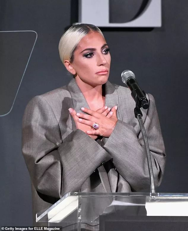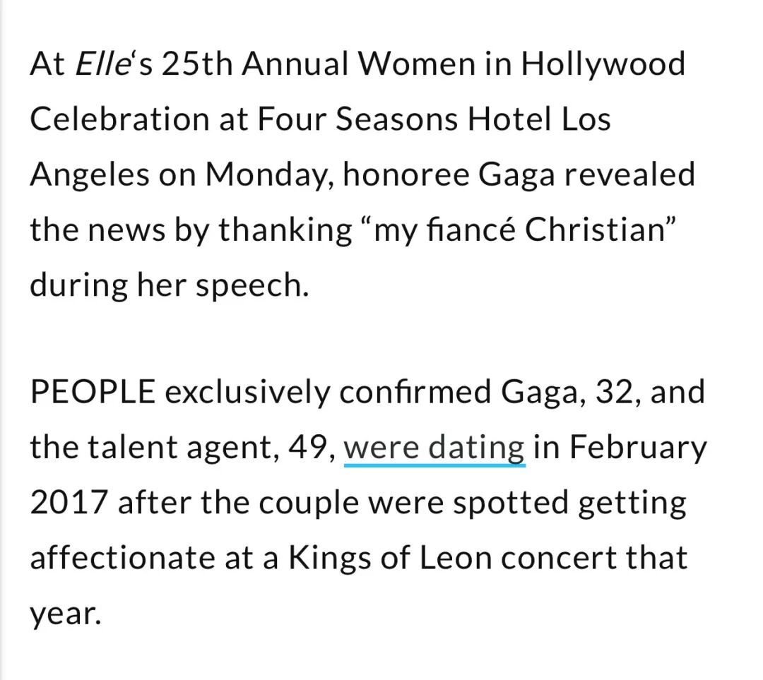 两人公布订婚是在上周一Elle的25周年好莱坞女性盛典上,32岁的Gaga穿着oversize的大西装做演讲,说到49岁的男友时表示“谢谢我的未婚夫Christian”。直接官宣了。