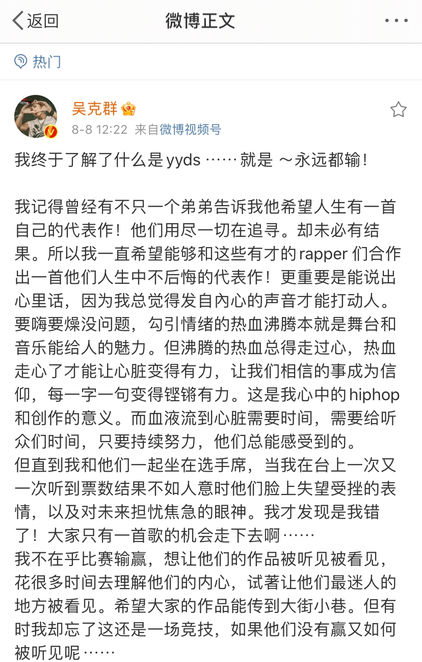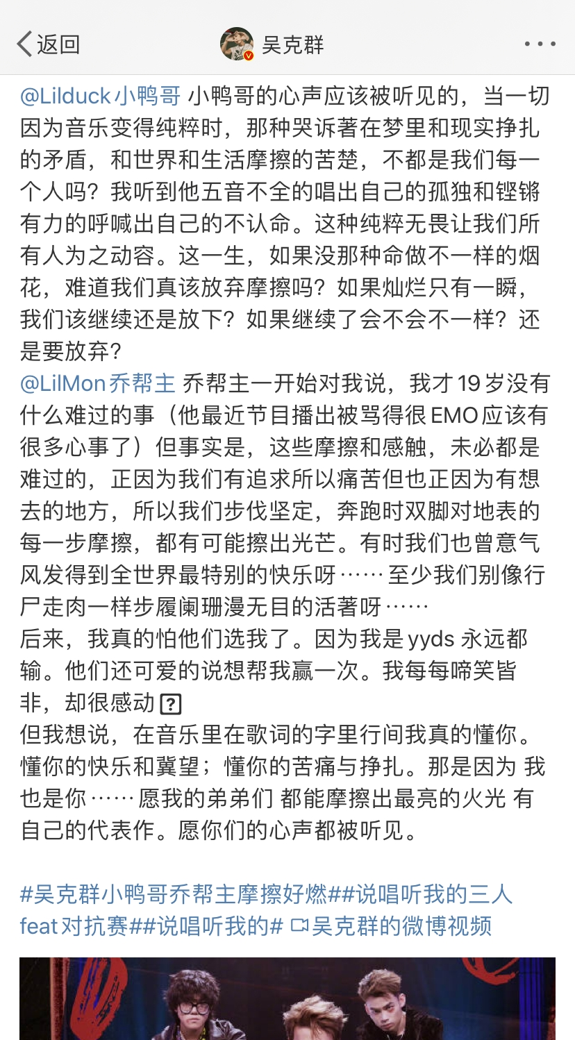 吴克群解释YYDS是永远都输,再度写长文鼓励小鸭哥! Swag西蒙 港台男星 2021-08-08 23:50:59 1128 创作不易,用心坚持,欢迎请BaGua喝几杯爱心咖啡!打赏并支持本文 打赏并删除本文 《说唱听我的》三人合作赛!《摩擦》 吴克群 X Lilduck小鸭哥 X LilMon乔帮主吴克群还写了长文给小鸭哥和LilMon!!兄弟姐妹萌记得【星标】公众号 最新推荐 热狗玩梗吴亦凡“我很大”直接被冲烂!《说唱企划》选手各种哭,真就说唱版《青你》?这边GAI刘聪功夫胖派克特热狗欧阳靖突然官宣!那边两节目继续互怼!Blow反击!开火!大年张思源廖效浓被《说唱企划》热门选手骂!大年连续回击,发话要锤死!【SWAG西蒙说唱重镇图鉴系列】(戳下方城市即可跳转观看)成都篇丨重庆篇丨云南篇丨南京篇丨上海篇丨北京篇丨西安篇丨长沙篇丨东北篇丨 新疆篇丨台湾篇丨香港篇丨广东篇丨公众号:SWAG西蒙最新的说唱嘻哈资讯微信扫描下图关注我.你点“赞”和“在看”了吗! 创作不易,用心坚持,欢迎请BaGua喝几杯爱心咖啡!打赏并支持本文 打赏并删除本文 感谢您的支持鼓励,我会继续努力的!文章地址:用户邮箱:打赏金额:USDT 请输入数字点击”去打赏“,即可进行打赏支持本文章哦 吴克群 About the Author Swag西蒙 功能介绍:Hip-Hop Related Posts 吴克群解释YYDS是永远都输,再度写长文鼓励小鸭哥! 2021-08-08 23:50:59 黄子韬Ty世纪和解,《新世代》让马思唯怀疑自己,最后却神奇大反转!这也太顶了吧! 2020-08-23 13:29:55 从Kanye到DOK2再到王嘉尔,这些Rapper为何中了阿迪的毒. 2019-02-22 22:10:07 徐真真TY的Diss变成川粤大战?海尔躺枪,说唱会馆孟子,天府事变,CG Vayn全部参战! 2018-10-27 13:53:34 中国新说唱“损失”了哪些NB人物? 2018-10-13 21:33:03 发表评论
