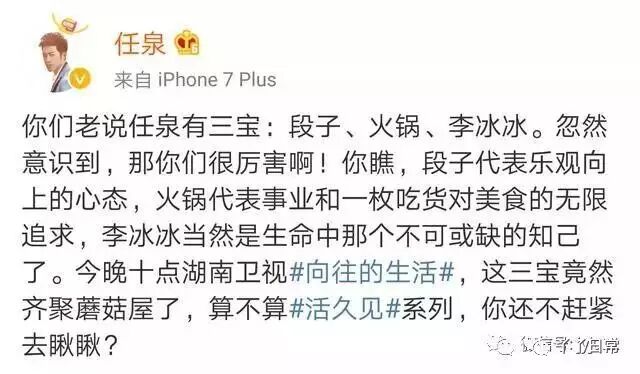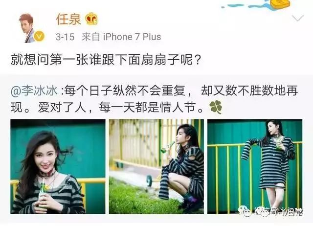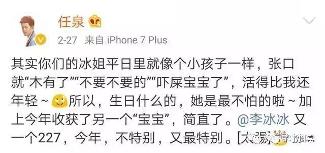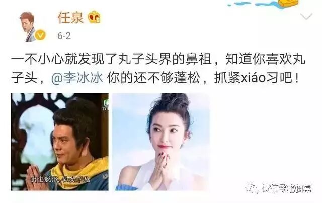 而李冰冰和任泉在私下互动频繁,在微博上也是。任泉还随时调侃李冰冰:“冰姐平时就像个小孩,张口就:木有了,吓屎宝宝了,不要不要的”,还有在李冰冰梳起丸子头时,调侃她说是丸子头的鼻祖,还配上一张《天龙八部》中鸠摩智的丸子头图片作为对比,同时任泉也称自己有三宝:段子,火锅,李冰冰。