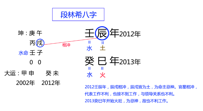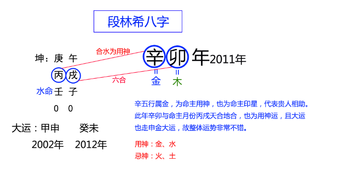 段林希2002年开始走10年金的大运,2011年也是流年金旺,正好是大运流年都遇到金,怪不得一夜爆红。