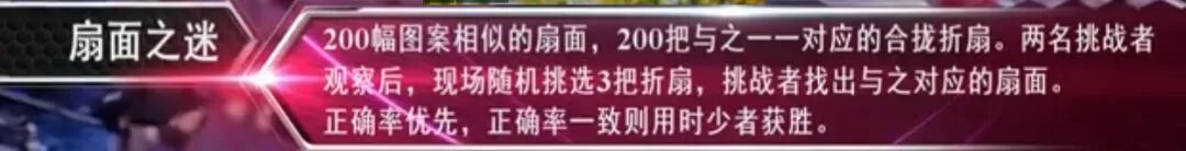国际评委挑出3把图案相似的扇子,在折叠情况下,挑战者从200把打开的扇子中找出那3把。
