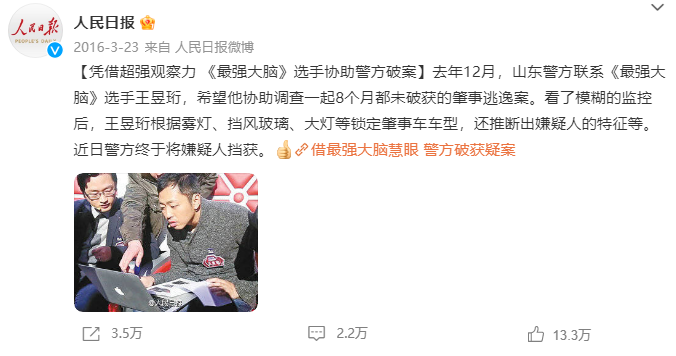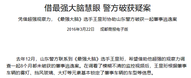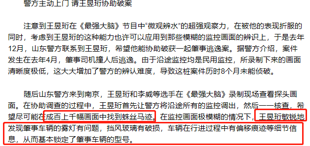 2015年,山东警方联系王昱珩,希望能借助他超强的观察力调查一起8个月未破获的肇事逃逸案。