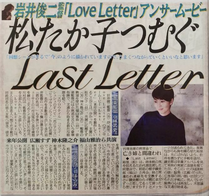 除此之外,岩井俊二还同时拍摄了日本版《你好,之华》,日版片名为《Last Letter》。从片名就能看出,中日两个版本的故事主体都是围绕着信件这个线索而展开的,剧情大体上一致。