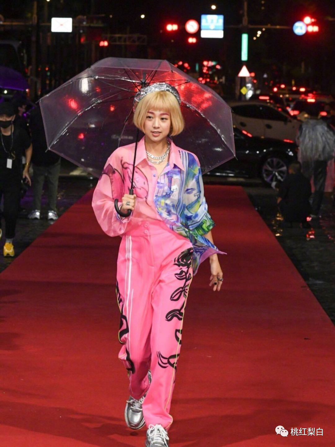 现在向我们走来的,是精心打扮的鬼鬼吴映洁,不仅将成套粉色睡衣穿出参加party的感觉,连假发和闪亮的贝雷帽也没落下,真:时尚弄潮儿。