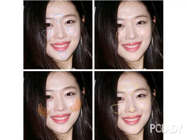 第一步:利用浅色的遮瑕膏遮盖重点部位的暗沉,为之后的提亮做打底工作,之后用自然的腮红膏叠加在重点部位,这样之后的高光不会过于明亮。