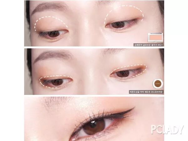眼妆就不要选择颗粒过大的珠光,先用粉橘色打底,深咖啡色勾勒出眼线,最后用眼线液笔描绘轮廓,在眼球的正中央点缀上,细腻的偏光眼影就足够啦!
