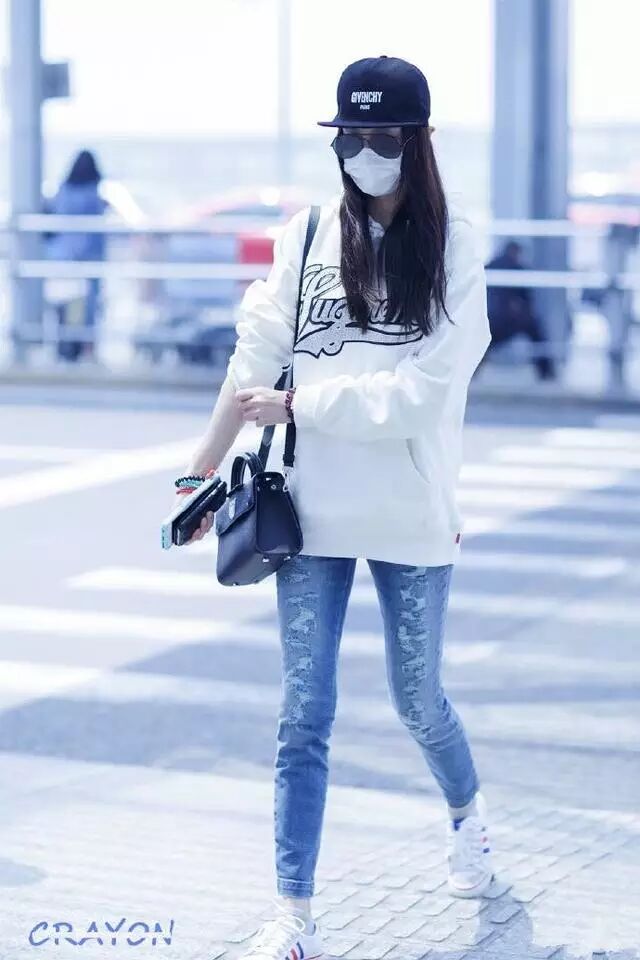 白色连帽卫衣配牛仔裤和小白鞋,气质清纯,简单干净的造型显得很清爽。