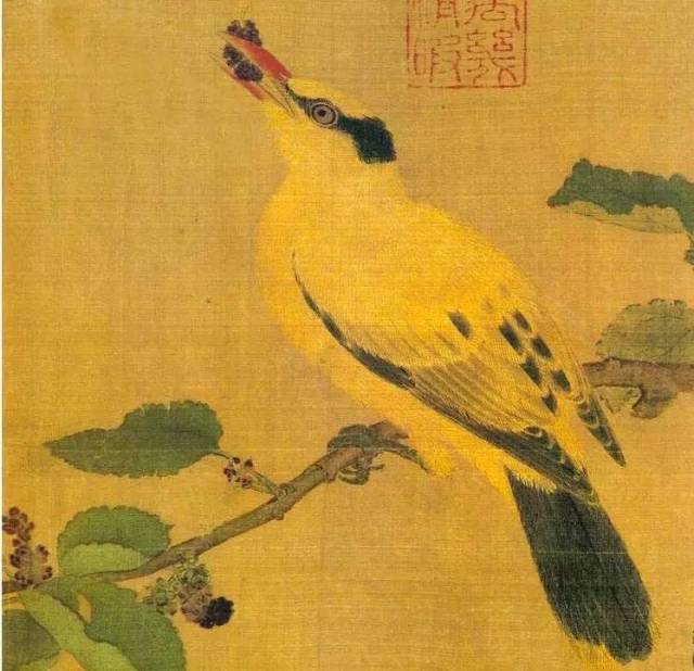 此图有宫廷画院的工丽之风,却多了几分粗犷率真。画面取一斜伸桑枝,在一细劲的枝条上站立一只山鸟,憨态可掬,嘴里还叼着桑葚,表情很有几分稚趣。