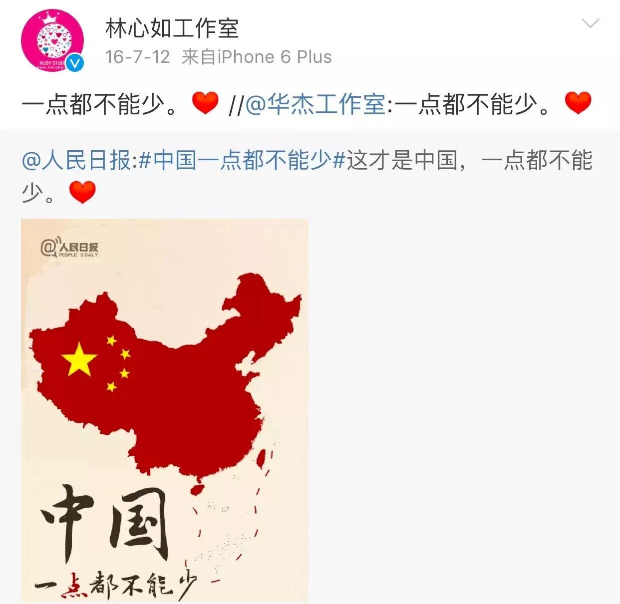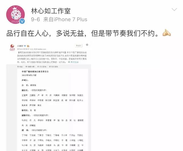 逼得林心如工作室附上一张2010年林心如参与为“钓鱼岛”发声的图并表示“带节奏我们不约”。