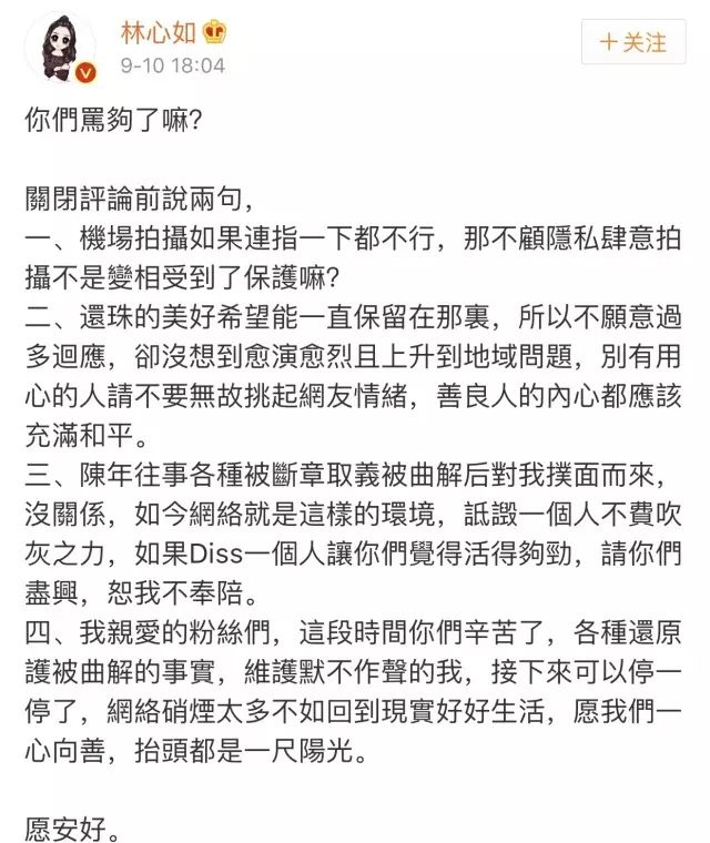 “手指镜头”事件成了压倒骆驼的最后一根稻草。林心如宣布关闭评论,希望“还珠的美好能一直保留”,希望大家“内心充满和平”。