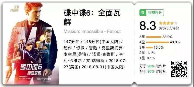 无疑,这部新作承载着这个系列最好的东西并不断前进,完美的致敬象征着这部电影已经成为了一种文化符号,阿汤哥每一次搏命的表演都代表着他对于电影的尊重。