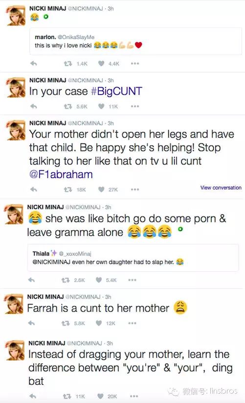 Nicki再次回击:两次用C-u-n-t这个词..并教训说不要把你妈扯进来, 不礼貌..