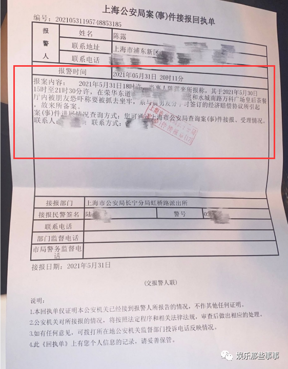 在王萌的陪同下,陈露选择报警处理,将起诉在房间里威胁自己的律师。王萌还晒出了他们的报警回执单,力证自己没有说谎。