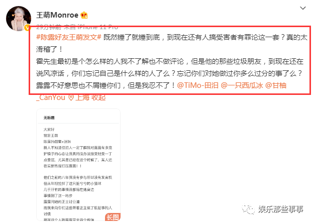 王萌先回应声了网上的质疑声,称自己是陈露的闺蜜和迷妹,关于霍尊和陈露之前交往的八年,自己并不知情,但今年霍尊及其团队的所作所为,自己却看在眼里。