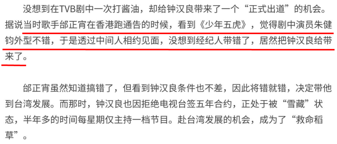 没想到中间人闹了个乌龙,错把钟汉良领来了,邰正宵一看这人条件也不错,就将错就错决定把钟汉良带去台湾发展~