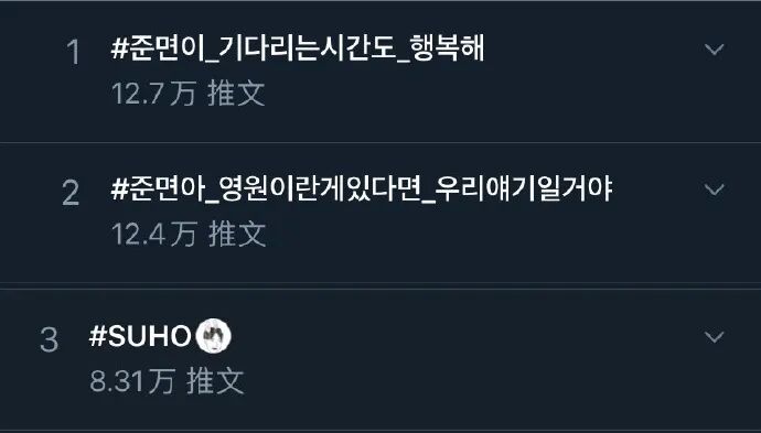 今天凌晨,粉丝们为了给SUHO应援,发了还通过推特热搜向金俊勉传达了她们的心意,她们说“等待俊勉的时间也是幸福的”、“俊勉啊 如果有永远的话,那说的就是我们呀”……
