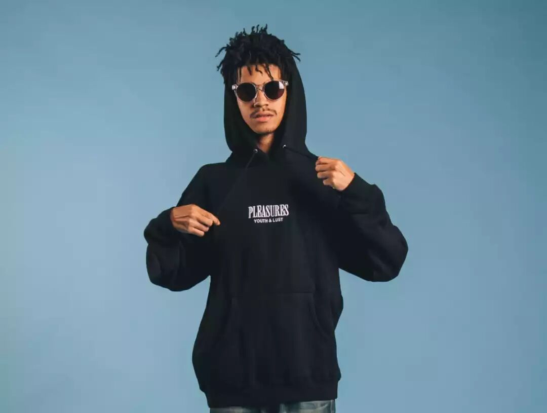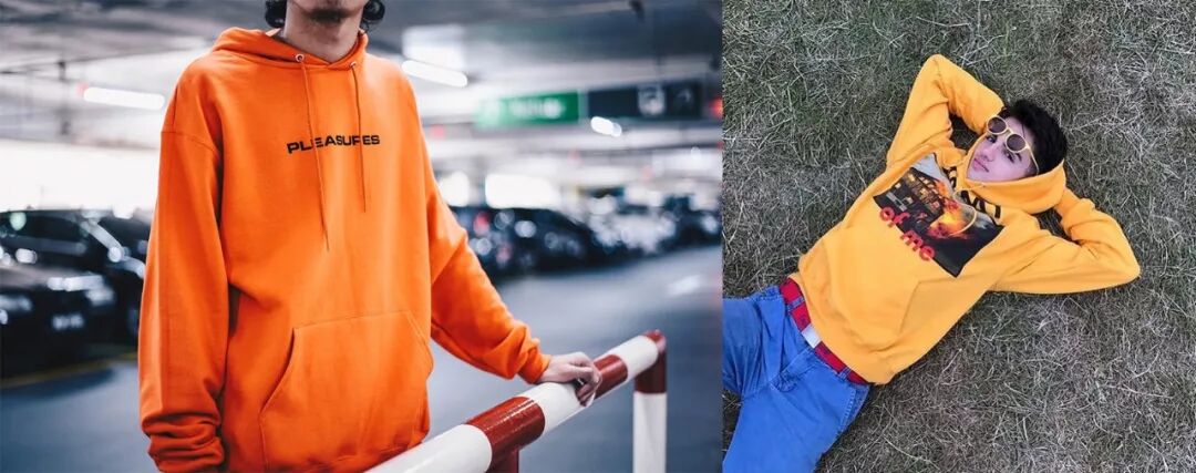 如果你喜欢颜色鲜艳的卫衣,Pleasures是个不错的选择,比如橘色、粉色......都可以找得到。
