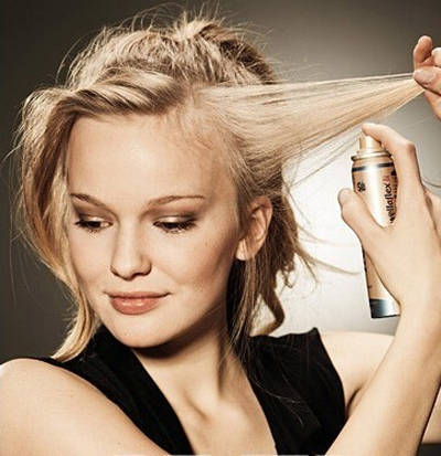STEP5:由于花苞头比较蓬松,在头发上喷上少量的定型产品,让发型保持的更加持久。
