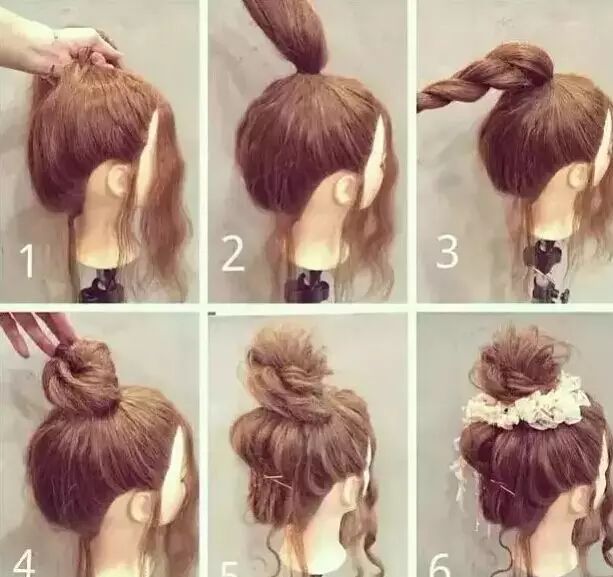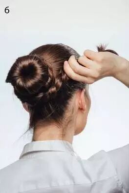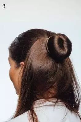 STEP3:将马尾缠绕在头顶,形成一个蓬松的花苞形状,然后用发卡固定住。