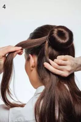 STEP3:剩下的发尾沿着发包向上缠绕,将长的发丝用橡皮筋固定,短的发丝随意额散落反而会更加自然。