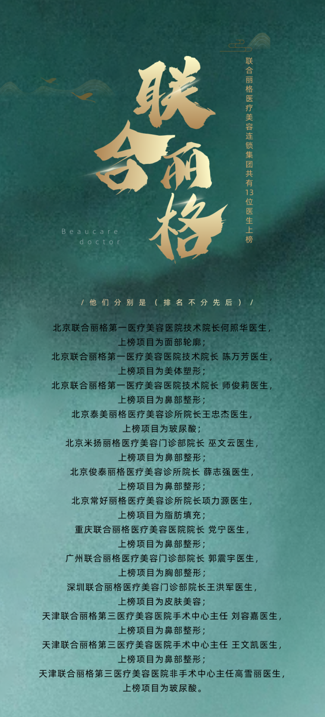 医生榜单评审标准从参赛医生提交的案例手术操作作品中,根据审美标准、手术经验、操作技术、手术特色、医院服务等方面从医生到医院的全方位评审。其中为保证比赛的公正公平,由第三方公司负责收集本次比赛信息,并且各评委角色和参选医生之间进行匿名评审,评委之间交叉评审打分,参选医生的最终得分为各个环节的综合评分。力求此次比赛的公平公正,用最高的标准考量医生的专业性,天津联合丽格刘容嘉主任,王文凯主任,高雪丽主任荣登上榜医生,凭借高超的水准入榜,实至名归!