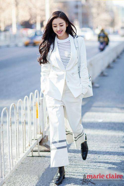 纯白的西装套装,阔腿裤搭配黑色短靴,率性十足