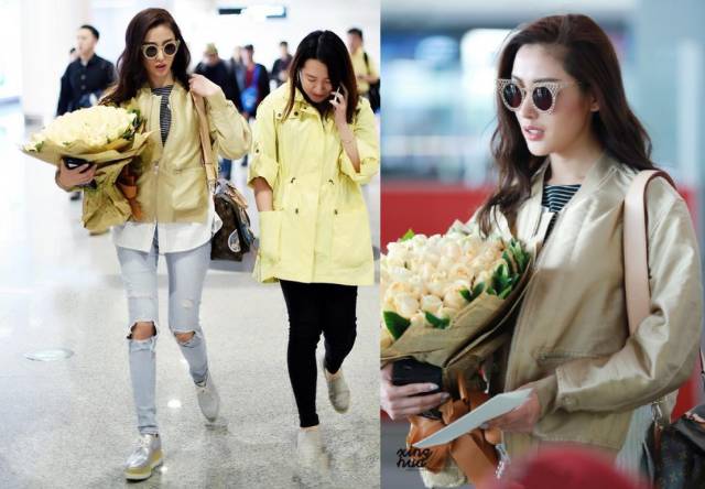 米黄色飞行员短夹克:3.1 Phillip Lim; 破洞牛仔裤:american eagle