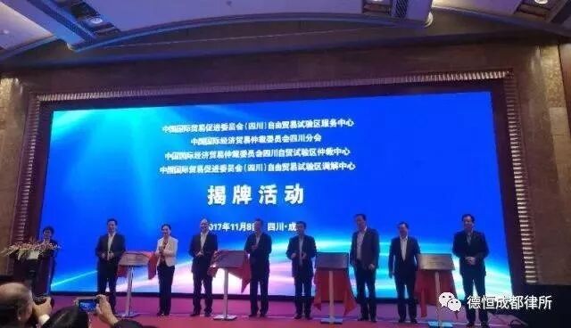 11月8日,中国国际贸易促进委员会(四川)自由贸易试验区服务中心、中国国际经济贸易仲裁委员会四川分会、中国国际经济贸易仲裁委员会四川自贸试验区仲裁中心、中国国际贸易促进委员会(四川)自由贸易试验区调解中心四个中心在成都揭牌。德恒成都办公室合伙人、中国国际经济贸易仲裁委员会仲裁员、成都市律协自贸区法律委员会主任黄勇律师,德恒成都办公室合伙人、成都市律协涉外法律专业委员会主任吴宇宏律师和德恒成都办公室合伙人沈建律师应邀出席揭牌仪式。