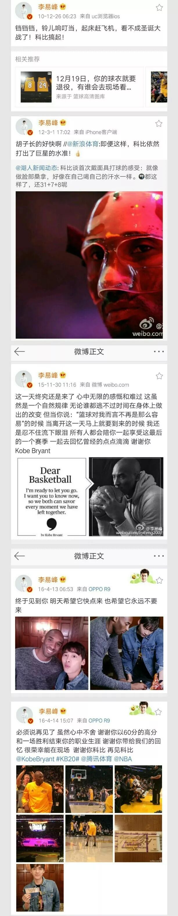 从2010年开始,李易峰就已经在微博亮出了“科蜜”的身份,他还经常在微博上向自己的偶像科比示爱↓