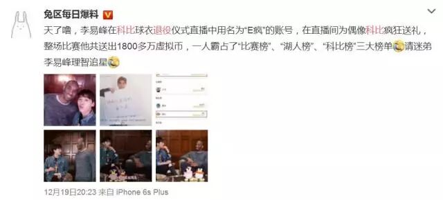 不仅写板报、拍视频示爱,李易峰还在科比球衣退役直播间里给科比狂刷礼物,整场比赛中一共送出1800多万虚拟币,折合人民币有18万。