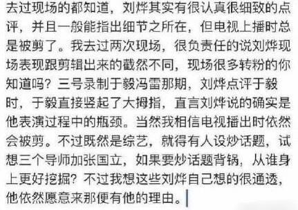 面对种种质疑声发酵,有现场观众看不下去,出来炮轰节目组剪辑故意误导观众,刘烨其实很认真细致的点评,现场和剪辑出来的截然不同。