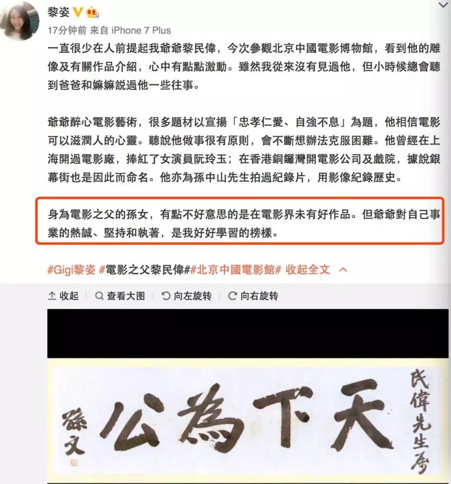 这次进京,黎姿也特意去了中国电影博物馆,看了一些关于她爷爷黎民伟的故事。