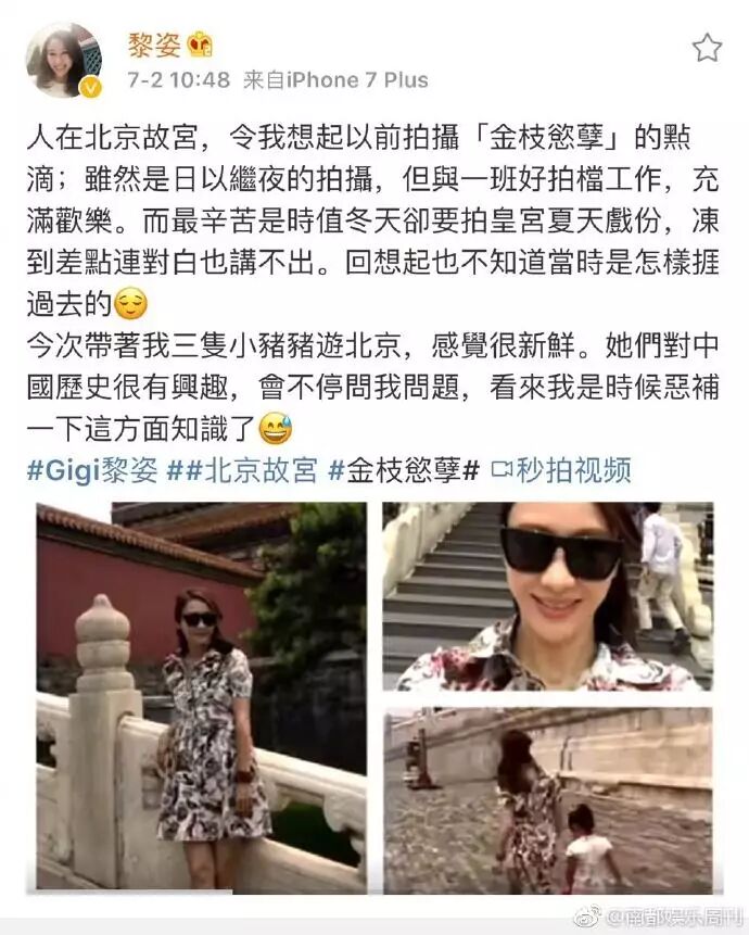 7月2日,黎姿在微博晒出一个小视频,她带三个女儿游故宫,了解中国历史。