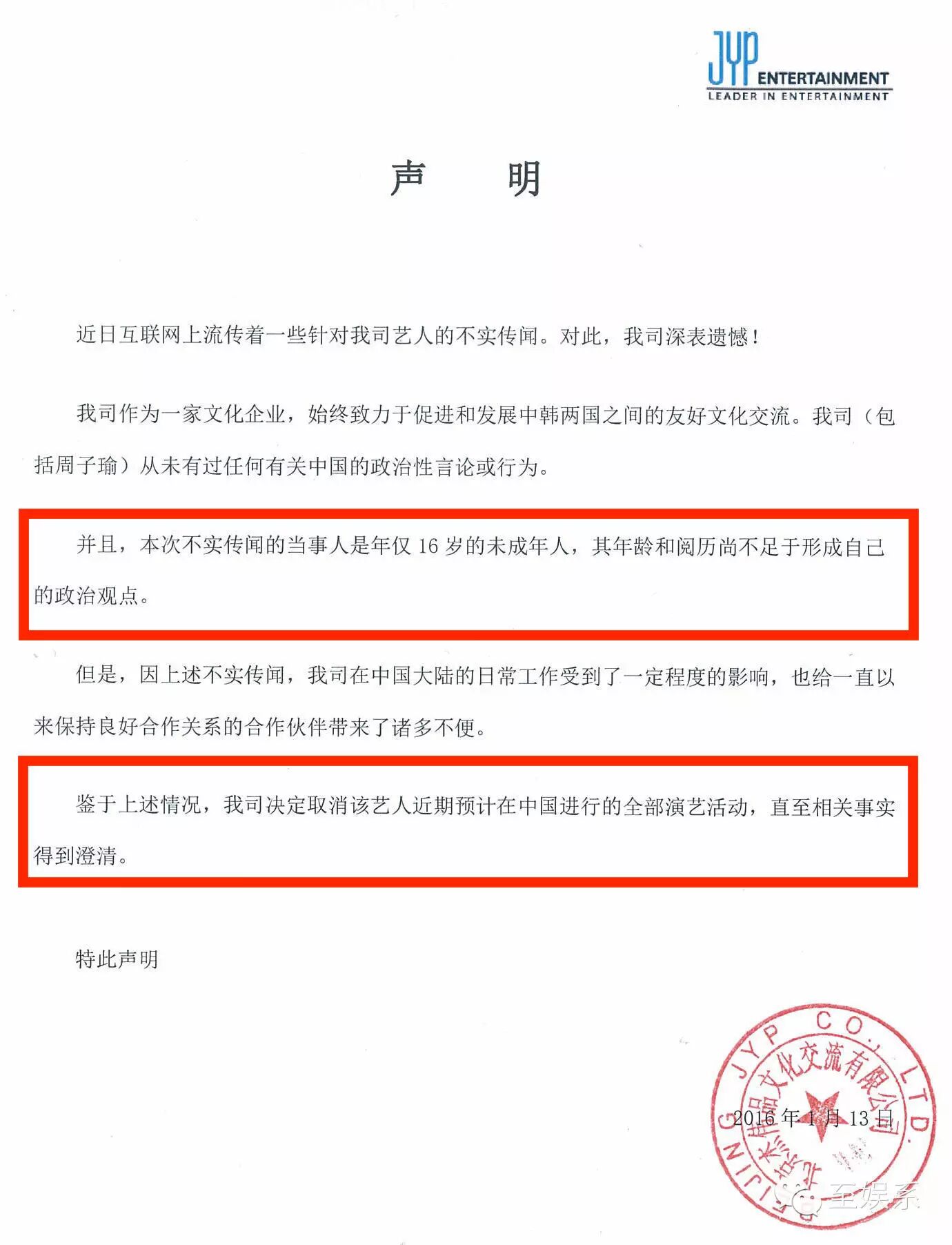 等了近两天之后,JYP的声明终于驾到。重点娱姬已经划出。