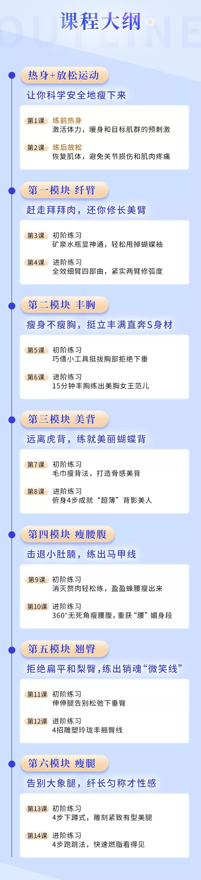 课程一共有14个课时,针对6个身体部位,用14套方案、60个瘦身姿势,带大家局部精准瘦身。