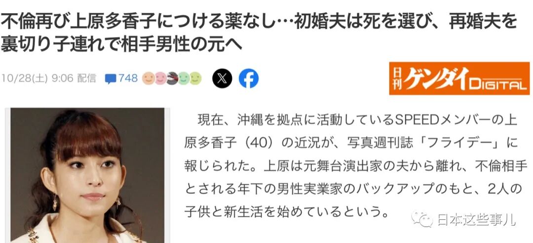 日本女星搞外遇逼死老公,再婚又偷吃被现任毒打,于是带着孩子投奔老王... 日本这些事儿 日韩女星 2023-11-01 17:03:30 311 创作不易,用心坚持,欢迎请BaGua喝几杯爱心咖啡!打赏并支持本文 打赏并删除本文 日本女星上原多香子曾为经典女团「SPEED」成员之一,2012年她与嘻哈歌手TENN结婚,然而却出轨已婚日本男星阿部力,导致老公2014年9月选择轻生。上原多香子2012年跟团体「ET-KING」成员TENN(森脇隆宏)结婚,2年之后,TENN被发现上吊自杀,上原多香子因为目睹老公自杀,陷入低潮、精神状况不佳,备受日本网友同情。但是没想到在2017年的时候来了个峰回路转,TENN的弟弟公开TENN轻生前的手机聊天记录,才发现是上原多香子因为TENN不孕而勾搭上男星阿部力,上原多香子甚至对外咎责于TENN精子有问题,想要孩子没要上,逼得TENN痛苦不堪才决定走上绝路。当时内幕曝光后,引起日本网友声浪谴责,上原多香子的演艺事业也随之陷入停滞,被演艺圈放逐。但在丑闻发生了不久后,上原多香子2018年再嫁作家高山和也,生下了一对儿女,但老公收入不稳定,2人节俭度日。没想到如今又被日媒《FLASH》爆料,她仍然"死性不改"又跟别的男人有外遇,又再度背叛第二任老公,这次出轨的是一名年轻有钱的企业家。被日媒爆出后,上原多香子跟现任老公摊牌,却惨遭老公愤怒家暴毒打,于是带着孩子投靠小王的新公寓,而男方身分也曝光。从网上的照片可见,上原多香子坦承出轨后带孩子离家,而生活上靠企业家小王全力支援,日本媒体还拍到她去幼儿园接小孩,企业家小王开车来接送。虽然还没有谈妥离婚,但已经开始新的过家家生活。根据多家日媒报导,原来,她年初1月回到家乡冲绳发展美容事业,并亲自担任社长,此时结识企业家王先生,双方来往密切,6月被丈夫得知两人偷情,她也坦承不伦,遭到丈夫暴力相向。这件事也惊动了警察,更一度传出上原多香子曾寻求同团成员、现今在政界活跃的今井绘理子协助,真的会玩啊!- END 创作不易,用心坚持,欢迎请BaGua喝几杯爱心咖啡!打赏并支持本文 打赏并删除本文 感谢您的支持鼓励,我会继续努力的!文章地址:用户邮箱:打赏金额:USDT 请输入数字点击”去打赏“,即可进行打赏支持本文章哦 上原多香子 发表评论