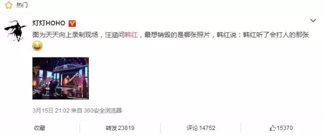 在这个轻松诙谐的综艺节目里主持人汪涵问韩红有什么愿望,韩红打趣说,她最想销毁自己那张“韩红听了想打人”表情包。